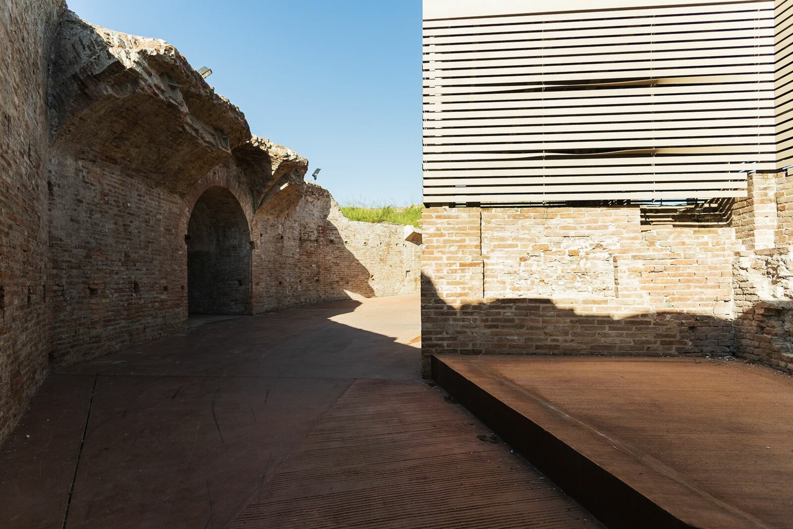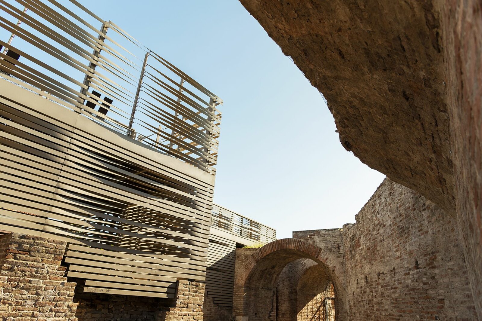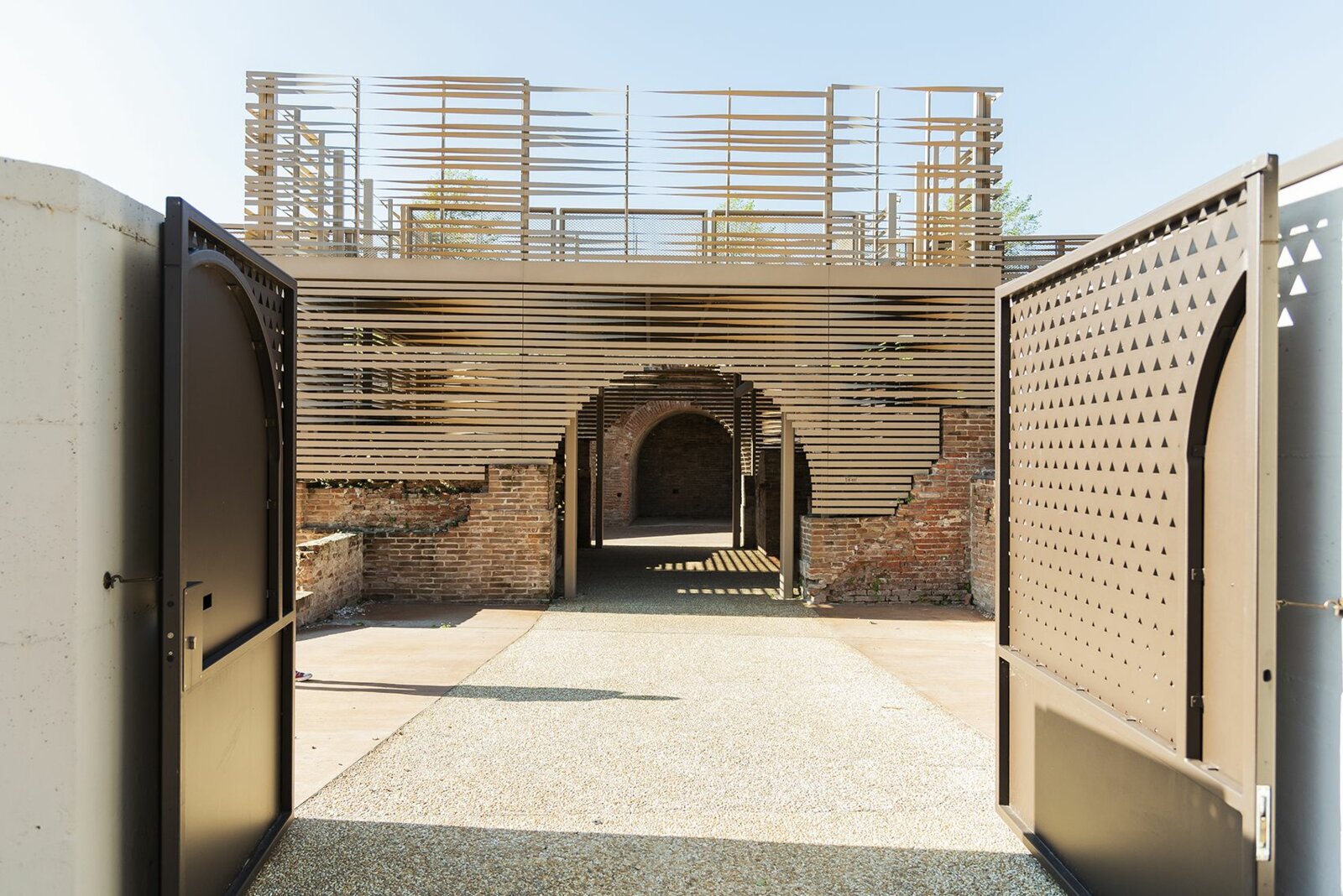 You can enter the Archaeological Park from Via Baluardi, through an iron gate placed between the two curtain walls of the area. Upon entering, you will be confronted by a curtain wall, consisting of the remains of the so called Borso's walls and the Porta dell'Amore (Gate of Love), which has been rearranged, and which rises upwards to reproduce the original volumes. Above this curtain wall, the walkway has been installed to reconnect the wall route, at the centre of which is the upper level of the Porta dell'Amore (Love Gate).