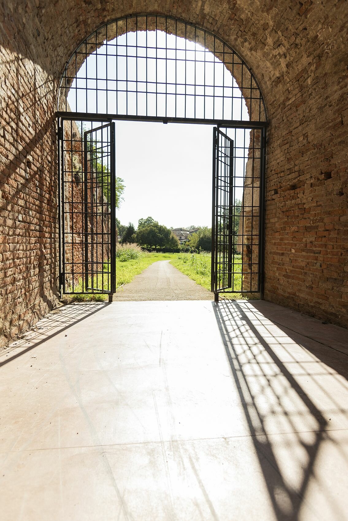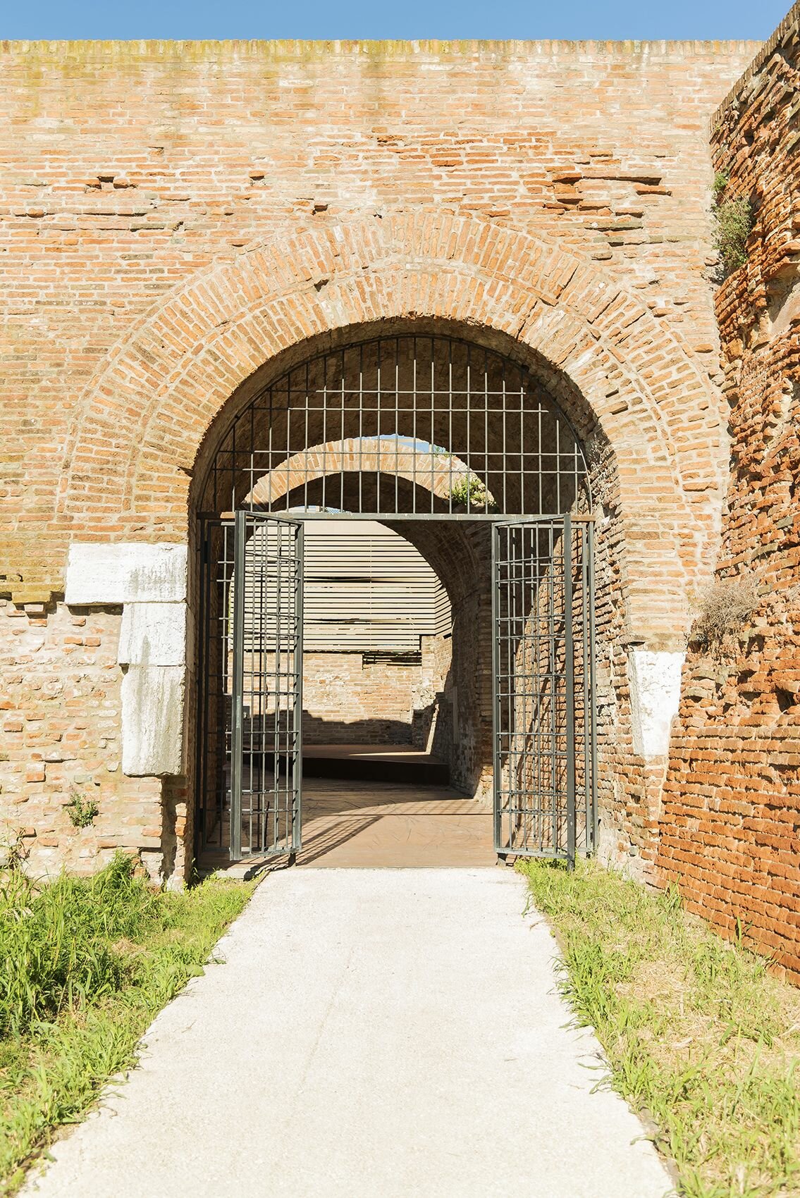 You can enter the park, passing under the gate, thanks to the "reconstructed" arch opening, and after observing the findings inside the tower, you can exit to observe the arrow-shaped ravelin dating back to 1557, restored and consolidated. Here you can visit two small rooms with barrel vaults, one in the centre originally used as a weapons store, and the other, on the north-west axis, used as a small oratory. On the masonry of the small bastion are clearly visible impost lines, ashlars and keystones of vaults that recall the covering system of the "gallery" interposed between Borso's walls and the ravelin; on the opposite ends, to the north-west and south-east, openings allow the exit to the rampart under the wall.